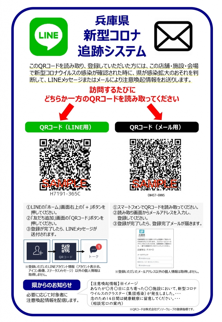 JUGEMテーマ:ガラス工芸・ガラス作品など 兵庫県では新型コロナウイルス感染症の次なる波に備え、施設の感染拡大防止のためクラスタ発生の恐れがあるときに注意喚起情報を提供する「兵庫県新型コロナ追跡システム」を構築しました。 来館の都度、スマホでQRコードを読み取りメールアドレスを登録していただくことで、クラスター発生時に県から注意喚起情報を送ります(メール通知とLINE通知をお選びいただけます)。 QRコードは受付に用意しています。 このシステムによって、入館拒否が...