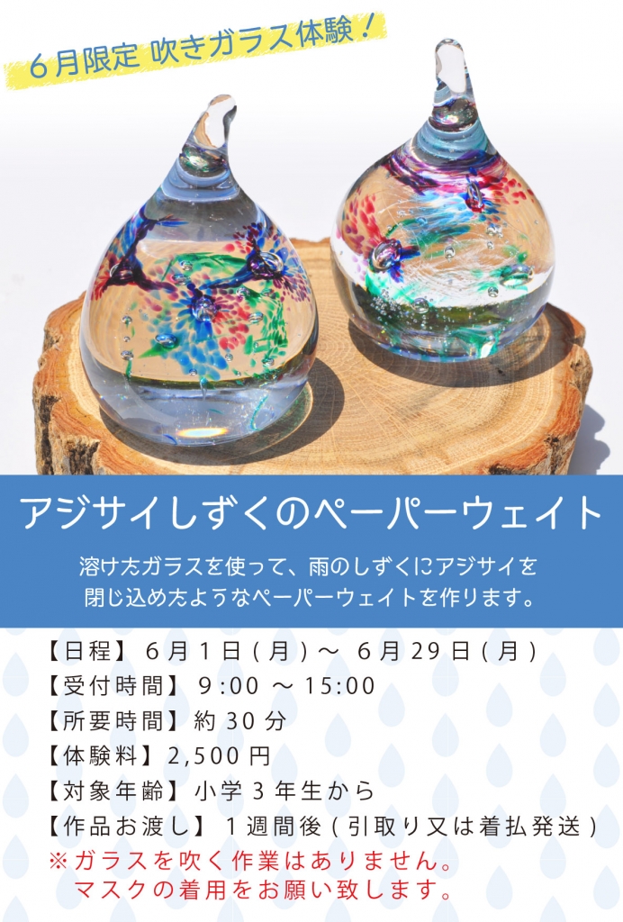 JUGEMテーマ:ガラス工芸・ガラス作品など 受講生各位 雨もようの鬱陶しい日々が続き、またコロナウイルス対策の自粛も少しずつ緩和されて参りましたが、いかがお過ごしでしょうか? 工芸館では紫陽花が満開を迎え、毎年この頃は剪定をどこまで行おうかと、悩む時期でもあります。 さて、今年は小学校の夏休みが短縮になりますので、それに合わせて工芸館も体験重視の夏休みシフトを8月1日(土)〜16日(日)とさせていただきます。 この期間の講座は、非常勤講師による講座は通常通りですが、常勤講...