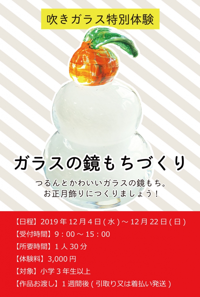 JUGEMテーマ:ガラス工芸・ガラス作品など ♦吹きガラス特別体験のお知らせです! つるんとかわいい「ガラスの鏡もち」をお正月飾りに つくってみませんか? ※お陰様で大好評につき受付終了いたしました※ (2019.12.19更新) ガラスの色は透明、白の2種から選べます。