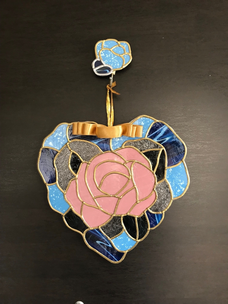 JUGEMテーマ:ガラス工芸・ガラス作品など ハートのバラのリースを作ってみました。 扉がダーク職なので、不透明なフィルムを選びました。 吊るすマグネット部も同じテイストでアートしました。