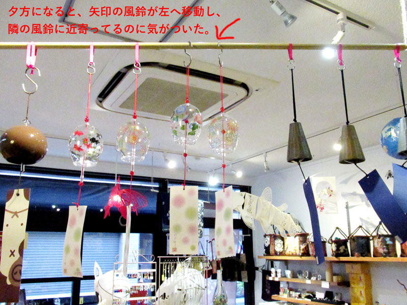 JUGEMテーマ:和雑貨 JUGEMテーマ:インテリア小物・雑貨 JUGEMテーマ:ガラス工芸・ガラス作品など 「心臓に悪い店」再び。 エアコンの風の当たりのせいだと思うのですが、ガラス風鈴が勝手に移動してホラーっぽいです。 日暮れの頃になると、聞き慣れない音がカンカン!と鳴るので見上げると、風鈴が1つだけ移動しており、隣の風鈴にぶつかるほど近寄っているのです。 それで、ガラス同士がぶつかる音、カンカン! 最初に認識した時は、ちょっとゾク...