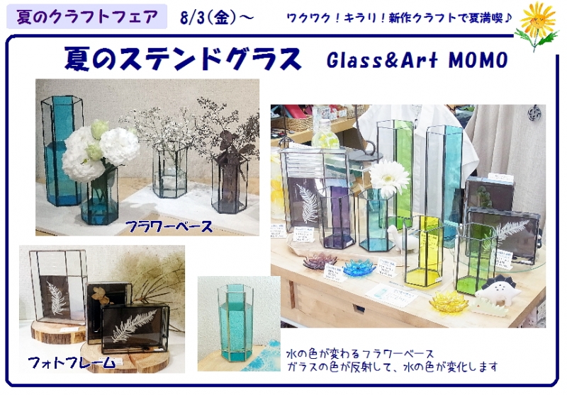 夏のクラフトフェア・後半開始です! ピックアップ展 その1 Glass&Art MOMO『夏のステンドグラス』 新作、フラワーベースとフォトフレームが並びました。 水の色が変化する!! 美しいフォルムのフラワーベースは、 ガラスの色が反射して、水の色が変わります。 ブルーはブルーに、グリーンはグリーンに、 色ガラスと同じ色にそれぞれ変化。 お花とともにお楽しみください。 アンティーク調のフォトフレームは、 色々な種類のガラスを組み合わせた落ち...