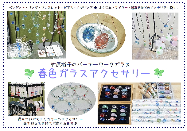 竹原裕子さん『春色アクセサリー展』開催中 柔らかいパステルカラーのアクセサリー、 春を迎える気持ちが膨らみます ペンダント・リング・ピアス・イヤリング・ブレスレット。 ようじ立て・マドラー・箸置きなどインテリア小物も! JUGEMテーマ:ハンドメイドアクセサリー JUGEMテーマ:ガラス工芸・ガラス作品など