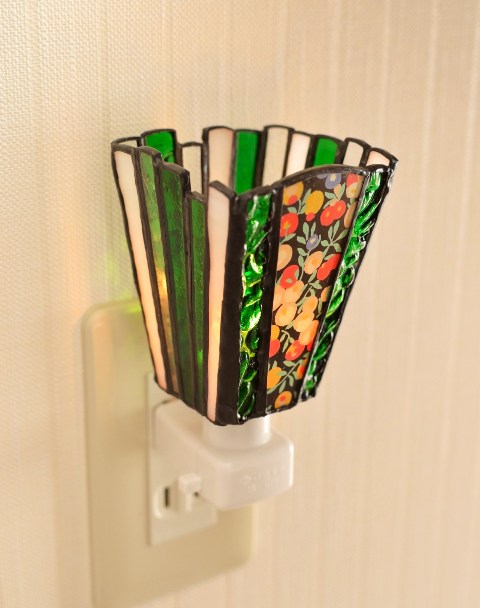 お客さまの作品です。 グリーンを基調にしたおやすみランプ 正面はリバティの"Wiltshire"を使いました。 グリーン、白、クリアガラスをランダムにストライプにして、とてもモダンで大人っぽい作品。 灯りの雰囲気もとても優しくて素敵なランプに仕上がりました。 *********** 現在、お店でのワークショップは募集していません<m(__)m> 次回、サルッガでのステンドグラス教室は3月11日 今日サンプルが出来上...