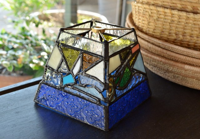 お客さまの作品です。 いろいろなガラスを敷き詰めたモザイクランプ ブルーのフローラガラスを基調に、シックな色合いで組み合わせれた大人っぽいランプ 4面、違うガラスを組み合わせてあるのでとても素敵です。 灯りを灯すとガラスの色合いももた変わってくるので、それも楽しみ 黒染めしたハンダが引き締まって見えるので雰囲気のあるランプになりました。 ***************** こち...