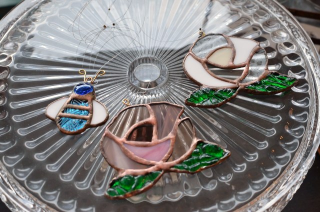 ステンドグラス続きます。 こちらはブルービーとお花のサンキャッチャー ブルービーがこんな羽のはずはないのですが・・・ あと、お花は最初は薔薇の予定がなんとなく形が薔薇っぽくなくなりました^^; 光にかざすととても可愛い (ピンクのお花は裏を向いてしまっています・・) 窓辺に飾って太陽の光を楽しむのも良いですね♪ ちなみにこちらはハンダの部分を...