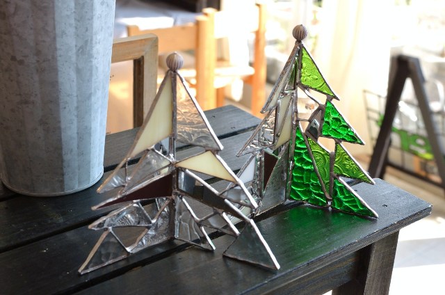 ちょっと早いですが、ツリー お客さまの作品と、サンプル一緒に作りました。 使っているガラスはクリア、エクリュ、グリーン、そしてミラー 茶色に見えるガラスはミラーの裏側になります。 ブラウンのガラスを使った感じにも見えてマッチしてます。 置き場所によって雰囲気が変わりますね。 ツリーのてっぺんには何か乗せたらかわいいよね〜と 目に入ったアクセサリービーズ ちょうどいい感...