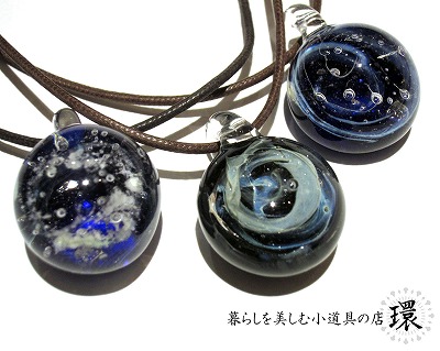 JUGEMテーマ:和雑貨 JUGEMテーマ:職人技 JUGEMテーマ:ガラス工芸・ガラス作品など 店頭をキラキラと飾ってくれている「ガラスペン」 このガラスペンを作っている「がらす工芸札幌」のガラスのアクセサリー。 本日の画像は「コスモス」 深みのある青や紺に、気泡が浮かんで星のようです。 色付きガラスの模様の上にのっている透明ガラスが、レンズのような働きをするので、奥行きが感じられて、じっと見入ってしまいます。 藤岡さんの奥様に伺ったところ、硬質ガラスに気泡...