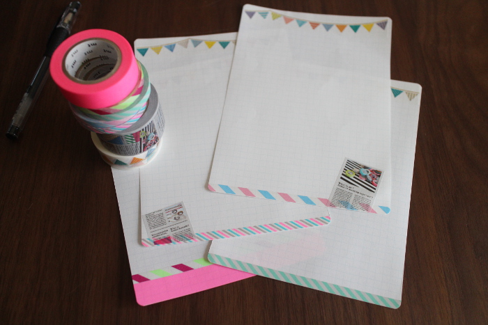 JUGEMテーマ:マスキングテープ 自作の便箋。 ゴテゴテやるのはあまり好きではないので、シンプルに。ワンポイントに「マステのマステ」を使用。 マステオンリー。マステ様さま。 使用したこはこいつら。 A4の方眼レポート紙を2分割にしてマステを貼り、仕上げに かどまるくん でコーナーを綺麗に。 最近ガーランドのマステがお気に入り。これちょー便利!貼るだけで一気にかわいくなる。 封筒はチャルカの花柄。 この薄くてぺらっぺらなかんじが大好物。 今日はこの封筒を使いたかった...