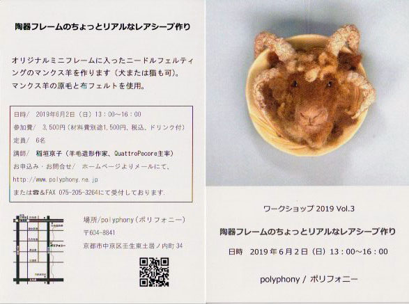 前野明子さんのお店で稲垣京子さんのワークショップが開かれます。 日時 2019年6月2日(日)13:00〜16:00 場所 polyphony 京都市中京区壬生東土居ノ内町34 TEL 075-205-3264 お問合せ、お申込みはpolyphonyまで