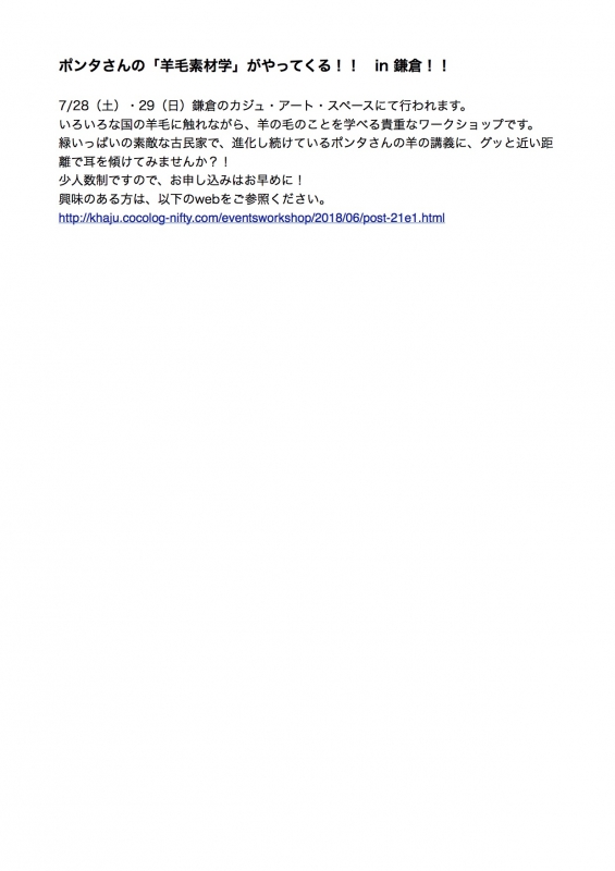 羊毛素材学 in 鎌倉 お申し込みは カジュ アートスペース まで http://khaju.cocolog-nifty.com/eventsworkshop/2018/06/post-21e1.html