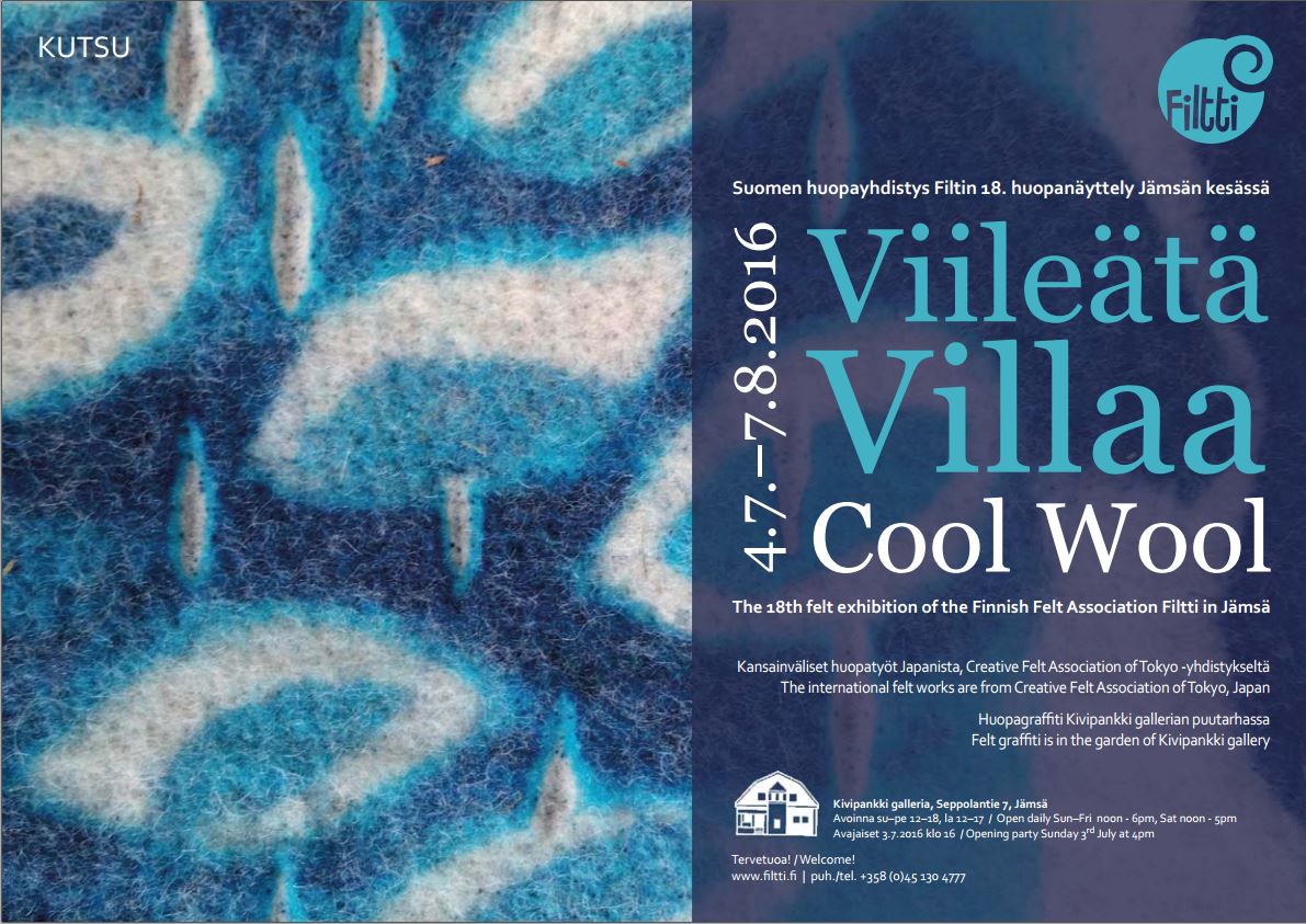 フィンランドのフェルト協会- Filtti ( http://www.filtti.fi/events.html)からの招請があり、『Cool Wool」』というテーマでの展覧会に、28名の会員が、審査を経て出展することになりました。 会期 2016年7月4日〜8月7日 会場 Kivipankki galleryーフィンランド Open 月〜金 12:00-18:00 土 12:00−17:00 Facebok https://www.facebook.com/GalleriaKivipankki オープニングパーティ 7月3日 16:00〜 巡回展(詳細は分かり次第...