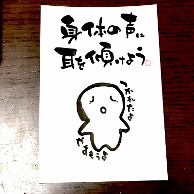 JUGEMテーマ:想いを伝える(*^_^*)アート書道表現人 こんばんは。 あとりええむえふ主宰の横山宮子です(*´▽`*) 最近寒くて、どうも体調がよろしくない感じ。 でも、ものすごく悪いわけじゃあなくって、 「なんだか」のどが痛い感じだったり、 「なんだか」頭がぼーっとするような感じだったり、 「なんだか」眠かったり・・・ 「なんだか」なんですよねぇ。 でも、それって、きっと身体くんの声だったりするのかな。 「ねぇねぇ、ちょっと休...
