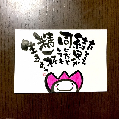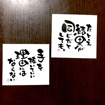 JUGEMテーマ:想いを伝える(*^_^*)アート書道表現人 こんばんは。 あとりええむえふ主宰の横山宮子です(*´▽`*) 今日から小学校の月曜日お話の時間が 再びスタートしました。 子どもたちと触れ合って 生き返る思いです(*´▽`*) さて、今日の筆文字は、昨日の続き。 「たとえ結果が同じだとしても」シリーズその2、です。 たとえ結果が火を見るより明らかだからって、 手を抜いていいわけじゃない。 だからね、精一杯生きよう。 &...