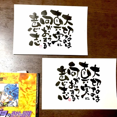 JUGEMテーマ:想いを伝える(*^_^*)アート書道表現人 こんばんは。 あとりええむえふ主宰の横山宮子です(*´▽`*) 「大切なのは真実に向かおうとする意志」 レオーネ・アバッキオの元同僚警官の言葉。 結果はどうあれ、その「意志」が大切なんだよね(*´▽`*) ブチャラティの言葉に続き。 ジョジョ5部からのコトバです。 ミンネで筆文字額販売始めました♪ 少しづつ作品増やしてまーす(*´▽`*) &nb...