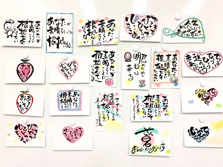 JUGEMテーマ:想いを伝える(*^_^*)アート書道表現人 こんばんは。 あとりええむえふ主宰の横山宮子です(*´▽`*) 今日は竜王筆文字教室、5回目。 文章をかっこよく書くコツ、その2でした。 試行錯誤でなかなかうまくいかない方も ちょっとしたコツで みるみる上手になっていきました(*´▽`*) みなさん、お上手です〜〜〜!!! 素晴らしい〜〜〜!!! 同じことをやっていても、 それぞれに、それぞれらしく ...