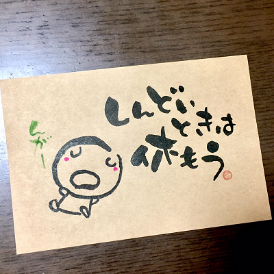 JUGEMテーマ:想いを伝える(*^_^*)アート書道表現人 こんばんは。 あとりええむえふ主宰の横山宮子です(*´▽`*) 本日2回目のブログ投稿は〜♪ いっつもフルスロットルじゃ、 疲れちゃうもんね。 体を休めて、 心も休めて。 しんどいときは休もう(*´▽`*) ***** 喜びの声が毎回たくさん寄せられる ゆる筆文字教室、出張開催もいたします♪ 詳しくはこちらをご覧ください ***** 手づくり絵本教室、製本教室開...