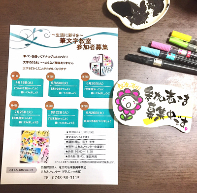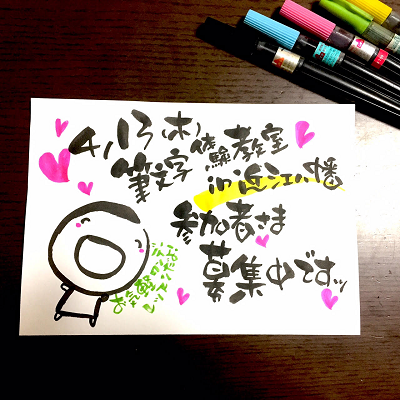 JUGEMテーマ:想いを伝える(*^_^*)アート書道表現人 こんばんは。 あとりええむえふ主宰の横山宮子です(*´▽`*) 4月13日木曜日、 ゆる筆文字体験教室を JEUGIAカルチャーセンター近江八幡にて (イオン近江八幡ショッピングセンター2番街(アクア21)3F ) 開催します(*´▽`*) 時間 10時30分〜12時30分 体験料 2000円 材料費 100円 持ち物 筆ペン(ぺんてる筆ペン極細もしくは中字推奨) そ・し・て! 5月からは全6回教室も開催しま...