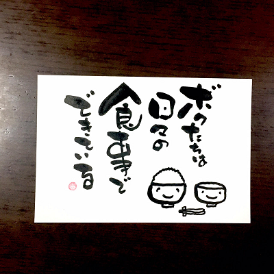JUGEMテーマ:想いを伝える(*^_^*)アート書道表現人 こんばんは。 あとりええむえふ主宰の横山宮子です(*´▽`*) 今日、幼稚園のおはなしボランティア、 今年度最後の絵本読みがありました。 年中さんクラスに入ったのですが、 もう、なんだか・・・・ 心が洗われました(*´▽`*) こうやって幼稚園で絵本を読めることに ただただ感謝♡ さて、今日の筆文字。 ボクたちの体は、日々の食事でできている。 ごはん、大切!! ち...