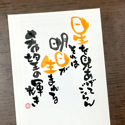 JUGEMテーマ:想いを伝える(*^_^*)アート書道表現人 こんばんは。 あとりええむえふ主宰の横山宮子です(*´▽`*) 星を見上げて。 それは、明日が生まれる希望の輝き。 さあ、今日はもうゆっくりおやすみなさい。 また明日(*´▽`*) ***** 喜びの声が毎回たくさん寄せられる ゆる筆文字教室、出張開催いたします♪ 詳しくはこちらをご覧ください 4月ゆる筆文字体験教室、 5月から本格スタートのゆる筆文字教室(全6回)募集中です。...