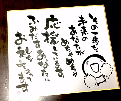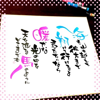 JUGEMテーマ:想いを伝える(*^_^*)アート書道表現人 こんばんは。 あとりええむえふ主宰の横山宮子です(*´▽`*) 今日は竜王筆文字教室、3回目。 今日はお楽しみの回なのですッ(≧▽≦) いつもと違って、色紙づくりに挑戦しました。 「色紙」といっても、台紙から作る飾れる色紙です。 今回は色紙に貼る作品を書いていただき、 最後に色紙の作り方、きれいに作るコツをお話しして 完成させました。 どんな色紙ができあがったかと...