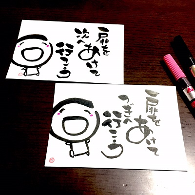 JUGEMテーマ:想いを伝える(*^_^*)アート書道表現人 こんばんは。 あとりええむえふ主宰の横山宮子です(*´▽`*) 次に行こう。 扉をあけて! ***** 筆文字教室、3名以上で出張開催します♪ 婦人会、子育てサークル、幼稚園・学校での活動、子育て支援センターetc.でも 筆文字教室させていただきます! お気軽にお問い合わせください(*´▽`*) mtwinklef@gmail.com (横山)まで ***** 手づくり絵本教室、出張教室いたします。 1回完...