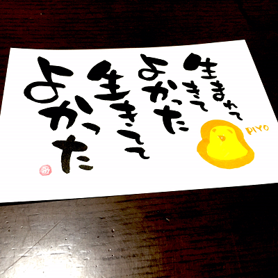 JUGEMテーマ:想いを伝える(*^_^*)アート書道表現人 こんばんは。 あとりええむえふ主宰の横山宮子です(*´▽`*) いろんなことがあるけどね、 生まれてきてよかったね、 生きててよかったね(*´▽`*) 大好きな「ピヨの恩返し」 (岩男潤子さんの歌、NHKみんなのうた2015年2-3月の歌)から。 この歌聞くと、いっつも泣ける〜(*´▽`*) ***** 筆文字教室、3名以上で出張開催します♪ 婦人会、子育てサーク...