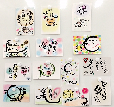 JUGEMテーマ:想いを伝える(*^_^*)アート書道表現人 こんにちは。 あとりええむえふ主宰の横山宮子です(*´▽`*) 今日は竜王筆文字教室第5回目でした。 敬老の日のためのカードを書こうがテーマ。 最初に漢字を書くコツをお話して、 みんなで練習(^^♪ 「長」と「楽」を例にとって練習したのですが、 ホント、生徒の皆さんのバリエーション豊かな文字たち!! 講師冥利に尽きるなぁと思ってしまいました(*´▽`*) その後、敬老の日の...