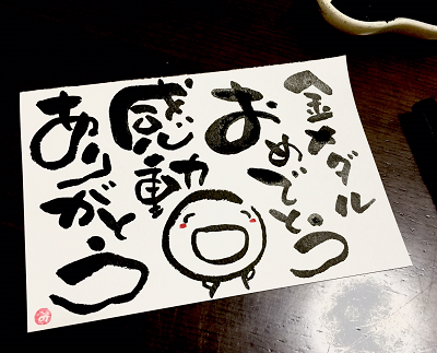 JUGEMテーマ:想いを伝える(*^_^*)アート書道表現人 こんにちは。 あとりええむえふ主宰の横山宮子です(*´▽`*) リオオリンピック、 日本選手の活躍が凄いですね!! 水泳、体操、柔道・・・ 朝起きて 参加しているすべての選手のみなさんに 感動をいただいています(*´▽`*) そして、頑張ってるすべての人に♡ ぼくちゃんメダルあげるっ(≧▽≦) ・・・って、描いたんですが もー、みぃんなに、ぼくちゃんメ...