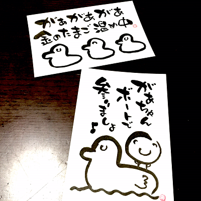 JUGEMテーマ:想いを伝える(*^_^*)アート書道表現人 こんばんは。 あとりええむえふ主宰の横山宮子です(*´▽`*) がぁがぁがぁ、金のたまご温め中♪ 誰もがみんな、金のたまごを温め中(*´▽`*) だから、きっと、大丈夫。 があちゃんボートに乗って参りましょ♪ ***** 筆文字教室、3名以上で出張開催します♪ 婦人会、子育てサークル、幼稚園・学校での活動、子育て支援センターetc.でも 筆文字教室させていただきます! お気軽にお問い合わ...