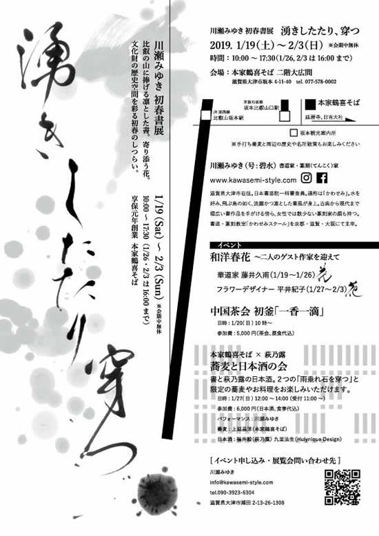 個展のご案内です。 川瀬みゆき初春書展 【湧きしたたり、穿つ】を開催いたします。 湖国に移り住んで4年、地元大津では初の書展となります。 会場は比叡山麓、坂本の地で300年前より営む本家鶴喜そばの大広間。 登録有形文化財の歴史あふれる空間に、書と篆刻あわせて31作品を展示します。 今回は、華道家の藤井久甫さん、フラワーアーティストの平井紀子さん、 お二人の作家をゲストに迎え、花によるしつらい「和洋春花」もご披露します。 坂本は延暦寺をはじめ、名所旧跡が多い観光スポットです。 新年のお...