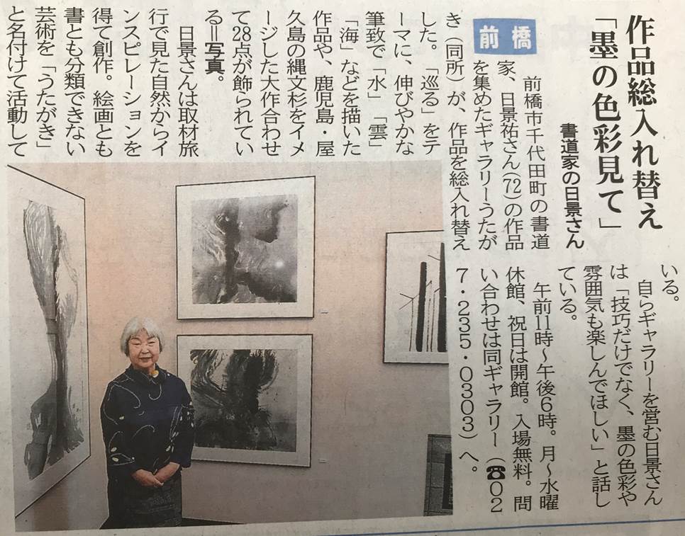 JUGEMテーマ:書道 4/23付けの上毛新聞に再び『ギャラリー詩畫』の取材記事が掲載されました! 定期的に作品を入れ替えていますが、今回は「巡る」をテーマにした展示に なっています。 お気軽に足をお運びください。 ギャラリー詩畫 群馬県前橋市千代田町3-2-25 TEL.027-235-0303 ACCESS : JR両毛線 前橋駅北口よりバス・タクシー7分または徒歩15分 OPEN : 木・金・土・日・祝日/11:00〜18:00 ...