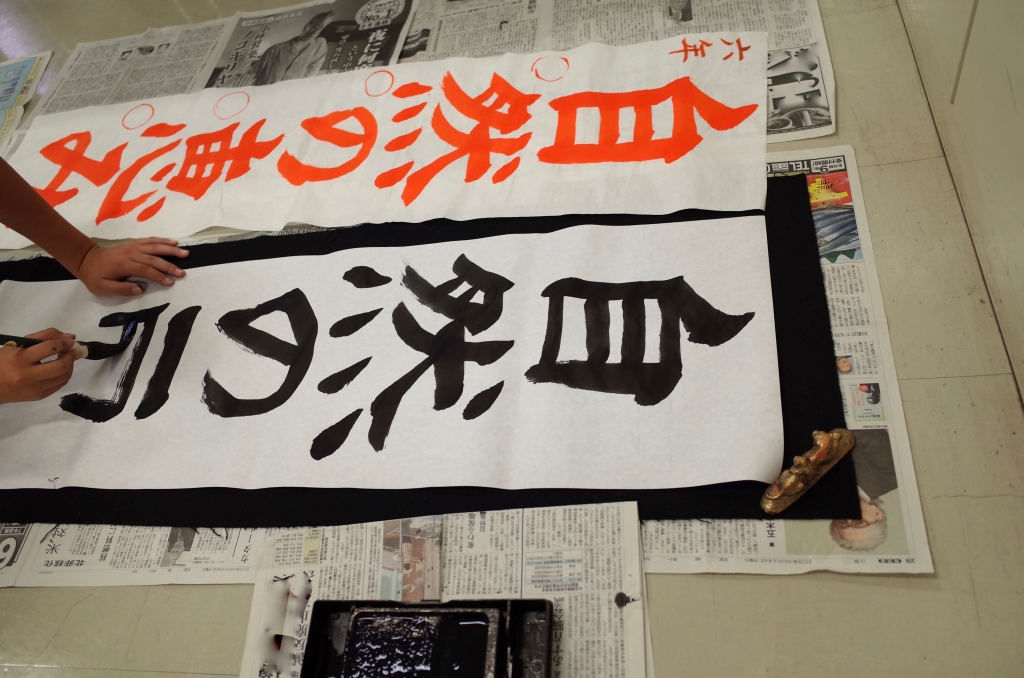 今月の毛筆は、条幅サイズも書きました。 縦136cm横34.5cmの大型紙の中心に体を置いて、 全体を見渡しながら書いていきます。 体を使って書くからか、「床で書く方が楽しい」という生徒もいます。 とはいっても、筆は半紙用よりかなり大きく、扱いも難しくなりますので 10月の児童選抜展に出す生徒を中心に、2級以上の希望者に書いてもらいました。 ↑生徒作品。選別中の様子 夏休みに頑張って書いたこれらの作品は、 10月13日...