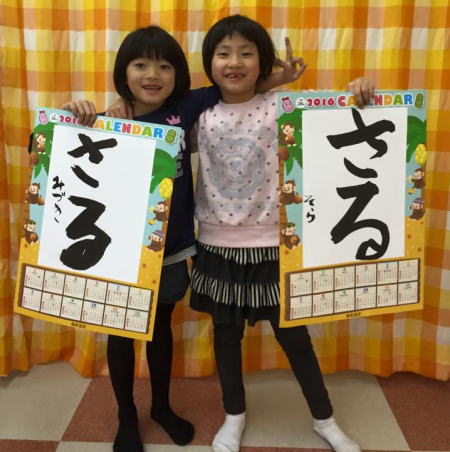 JUGEMテーマ:書道 お習字を始めてから3ヶ月!みんな、すっごく上手になってきました! 来年度のカレンダー作りも、バッチリ!d(^_^o) 元気な「さる」「申」が書けました! みんな一発勝負やけど、うまいね!! 左利き一年生コンビだけど、頑張って右でかいたよー!