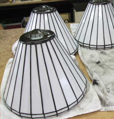 JUGEMテーマ:ステンドグラス制作 5月24日(土)に体験された方で お一人だけ時間が無くなりランプを置いていかれました。E様☆ ハンダのやり直しを部分的にし 再度ブラックパティーナ&ポリワックス仕上げをして きれいに出来上がりました☆ ご本人も納得の一品になったようですvv 24日の出来上がり写真に参加できなかったので 今回させていただきます☆☆ お疲れ様でした☆ お菓子の差し入れありがとうございます☆☆