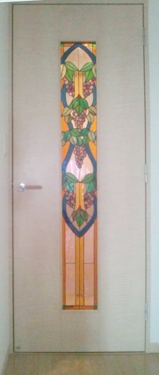 JUGEMテーマ:ステンドグラス制作 ドア用ステンドグラス 取付完了いたしました! 最初ドアには縦に4つの正方形ガラスが入っていましたが 建具屋さんに縦にガラス部分を長くくりぬいていただき 長いステンドを取付けました☆
