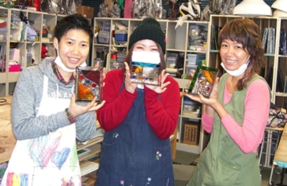JUGEMテーマ:ステンドグラス制作 仲の良い3名様が体験教室に参加しました。 3人はガラスが選べる≪モザイク-サークル≫と≪モザイク-スクエア≫に挑戦!!凄く楽しかった様子でクリスマス体験教室も参加したいとのことでした!お疲れ様でした。