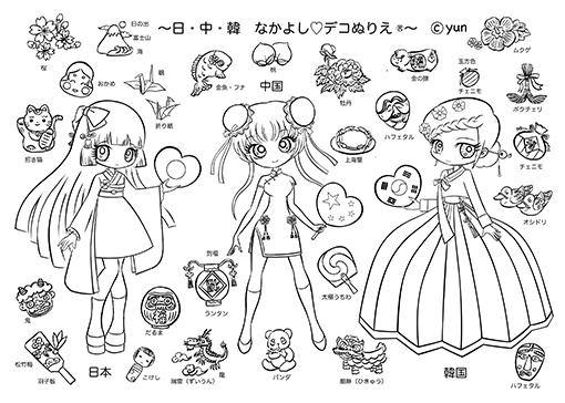 JUGEMテーマ:デコぬりえ 2019.5.2.thurs (。Ő▽Ő。)ノ゙♡*৹“〜日・中・韓 なかよし♡デコぬりえ®〜”のぬりえ画が完成致しました! ↓回遊美術館・5/19のデコぬりえ®ワークショップは、こちらのぬりえ画で実施致します♬ (*^^*)少女達が民族衣装を着ている事&国旗を♡型にした事だけでは、ちょっと弱いと思ったので、各国の縁起物も描く事にしました。 (;^_^Aですが、重大な問題点が!!!日本人なので...