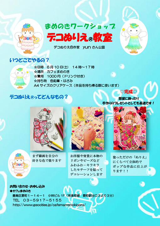 JUGEMテーマ:デコぬりえ 2015.6.20(sat) (。Ő▽Ő。)ノ゙梅雨の晴れ間の中.yunのデコぬりえ教室.初の試み.インストラクターコースが始動致しました〜〜!!! 記念すべき.第1回目は.cafeまめのきにて開催しますた。受講してくれたみなたま.とても.イキイキ熱心にお勉強してくれまして.大変胸キュンな初回となりました。৲( ˃̶̤⌄˂̶̤ ` )৴♡*৹感激です♪ まめのきさんは.先月.参加していたイベント(池ポス展)でご一緒したcafeで.特定非営利活動法人ワー...
