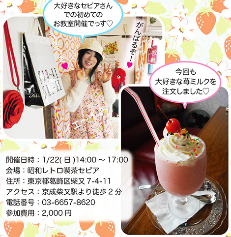 JUGEMテーマ:デコぬりえ 2017.1.22.sun (*>_<*)寒に入ってからは暦どうりに大変寒い日が続いておりマス。そんな中、急に、ぽかぽかと暖かかった1日。。。人ぞ知る柴又の人気店「昭和レトロ喫茶セピア」さんで、初めてのデコぬりえ®教室を開催いたしました♡(๑′ᴗ‵๑)嬉しい♡ デコぬりえ®教室の会場は、セピアさん2Fの「昭和の子供部屋」です!調度品がなにもかもかわいらしいお部屋で、見ているだけで楽しい気分になっちゃいました。...