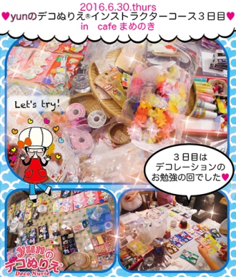 JUGEMテーマ:デコぬりえ 2016.6.30.thurs ✩*⋆¸¸.•*¨*(๑•ᴗ•๑)/*¨*•.¸¸⋆*✩ yunのデコぬりえ®インストラクターコース3日目、デコレーションの仕方の回でした♪ この回で講義・実習は終了になり、次回は実技試験となりマス。デコぬりえ®インストラクター候補のみなたま、おつかれさまでした〜!!!m(*- -*)m ♡最後はすごい集中力デシタ♡ ...
