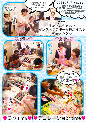 JUGEMテーマ:デコぬりえ 2016.7.7.thurs〜7.9.sat 梅雨のような夏のような、、、はっきりしない季節の今日この頃。2日間にわたり行われた「第2期・yunのデコぬりえ®インストラクターコース・実技試験」が終了し、めでたく、デコぬりえ®インストラクターが7名誕生致しました♪ (。Ő▽Ő。)ノ゙暑い中、雨の中、実技試験の「まめのきデコぬりえ®教室」に参加してくださったみなたま、大変ありがとうございました!参加してくださった皆様が、インストラクター候補さん達...
