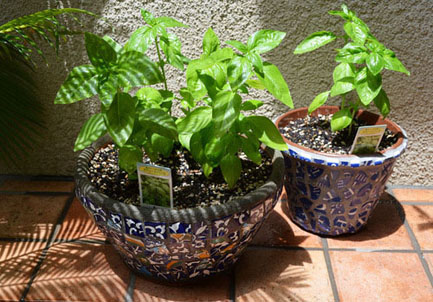 モザイク・タイル sweet basil and mosaic flowerpot . I planted the basil seedlings two weeks ago. スウィートバジル とモザイクの植木鉢。 左はチュニジアのタイルを使って、右はお皿を使って作ったモザイク植木鉢。