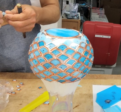 JUGEMテーマ:日々徒然 JUGEMテーマ:ステンドグラス 本来のガラスモザイクは、ガラスをカットし セメント状の物で接着をします こちらは、ステンドグラスで再現していますので より細密になっています コツコツ 同じ形のピースを 根気よく カットされています モールド(型)は、花瓶です 新型コロナウイルス感染症対策 教室では、生徒さんが戻って...