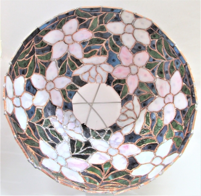 JUGEMテーマ:日々徒然 JUGEMテーマ:ステンドグラス ティファニーランプの ピオニードーム モールド(型)から外れ ガラスの色合いが少し見えました ピオニー(芍薬)の花のガラスは、色味を抑えた2種類のヤカゲニー バックのブルー系のガラスもヤカゲニーです トップは、キャノピーでは、無く リングにされるご予定 新型コロナウイルス感染症対策 教室では、生徒さんが戻っていらし...