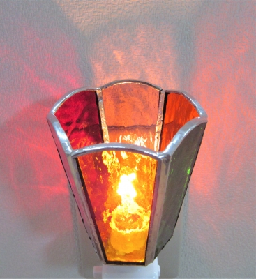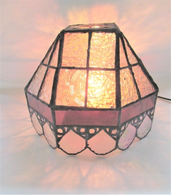 JUGEMテーマ:ステンドグラス 数種類のクリア系ガラスと 赤紫のアンティークガラスが魅力的です ライトは、仮の物です 実際は、鉄のベースのフロアーランプになります アラベスク模様風の カッパーシートと 縁飾りになっている ウェーブテープが アンティークな雰囲気に良く似合...