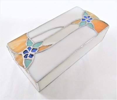 JUGEMテーマ:ステンドグラス 初自由作品で ティシュカバーを制作されました 白いガラスは、ウィスマーク 側面は、イリィディセント(ほんのり虹色)部分を表に 上部は、白い部分を使用されています ブルーのお花は、キャセガラス アンバーは、ヤカゲニーです ...