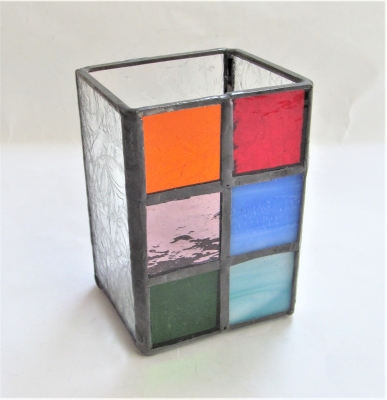 JUGEMテーマ:ステンドグラス 夏休みの工作で 鉛筆立てを作りにいらして下さいました 赤、オレンジ、ブルーの濃淡、薄ピンク、グリーン 六色のガラスをお選びになり テープ巻き ハンダ付けも頑張りました ペン立てとしてだけで無く キャンドルホルダーや、お花も飾って楽しんで下さい 結婚...