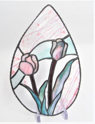 JUGEMテーマ:ステンドグラス 今の季節にピッタリの チューリップのお花です ティアドロップの メタリカフレームには、入れずに ねじり銅線で 飾りました 可愛いフラクチャー(紙吹雪の様なテクスチャー)のピンクは、ブルズアイ 葉っぱもブル...