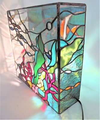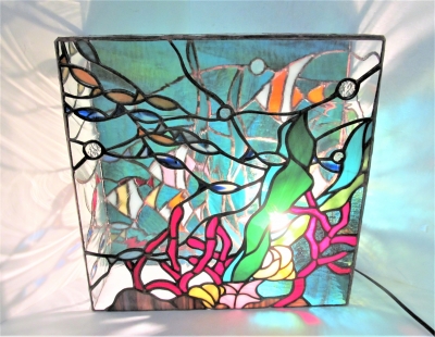 JUGEMテーマ:ステンドグラス REGALOの 人気デザイン型紙 「カリブ」を制作されました 箱形の 水槽風ランプです 前面は、クリア系のガラスなので 奥のお魚も見えて綺麗です 点灯しない時の 色合いも 雰...